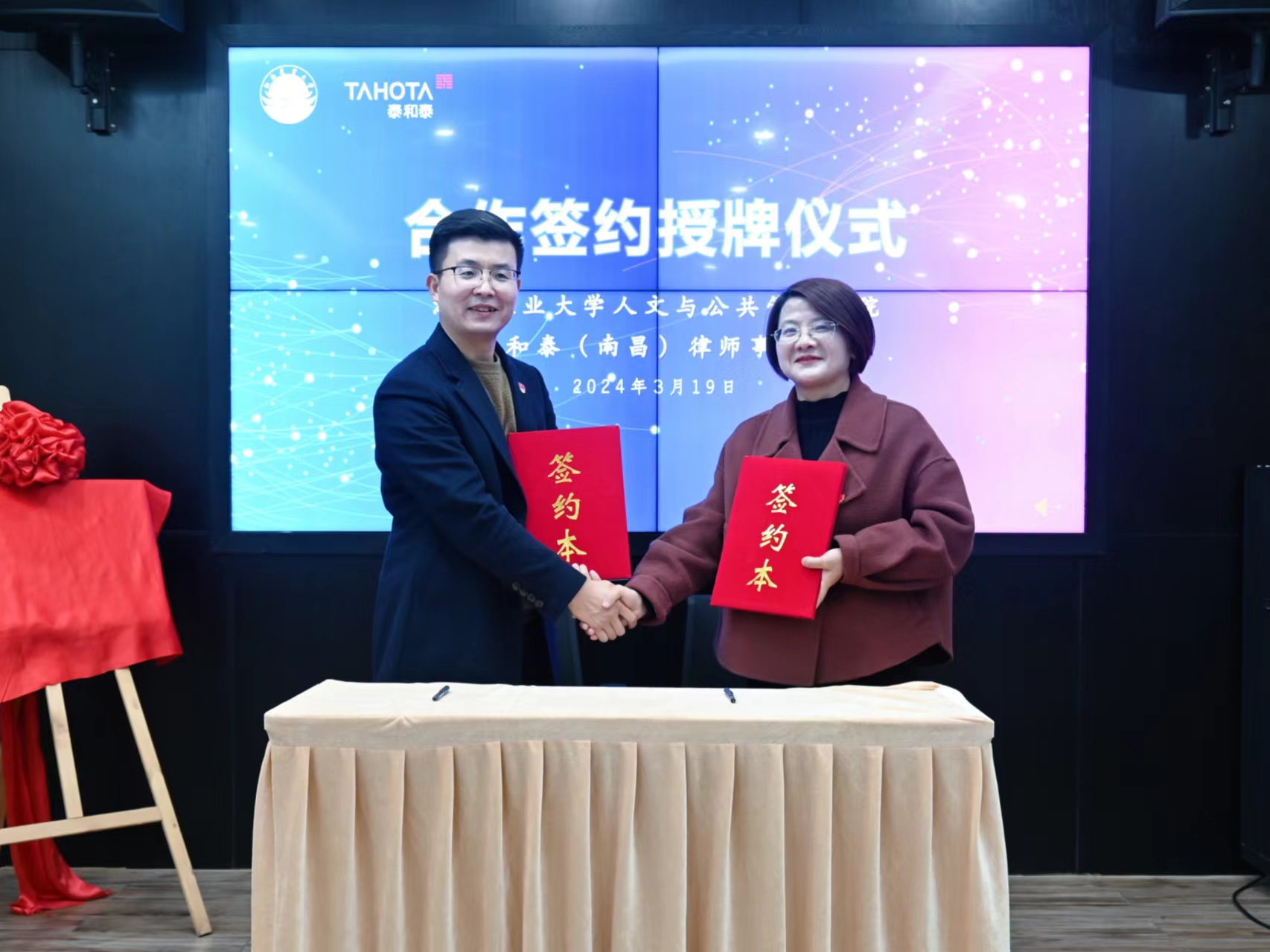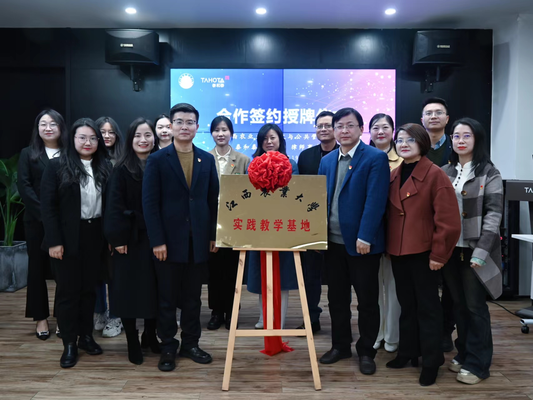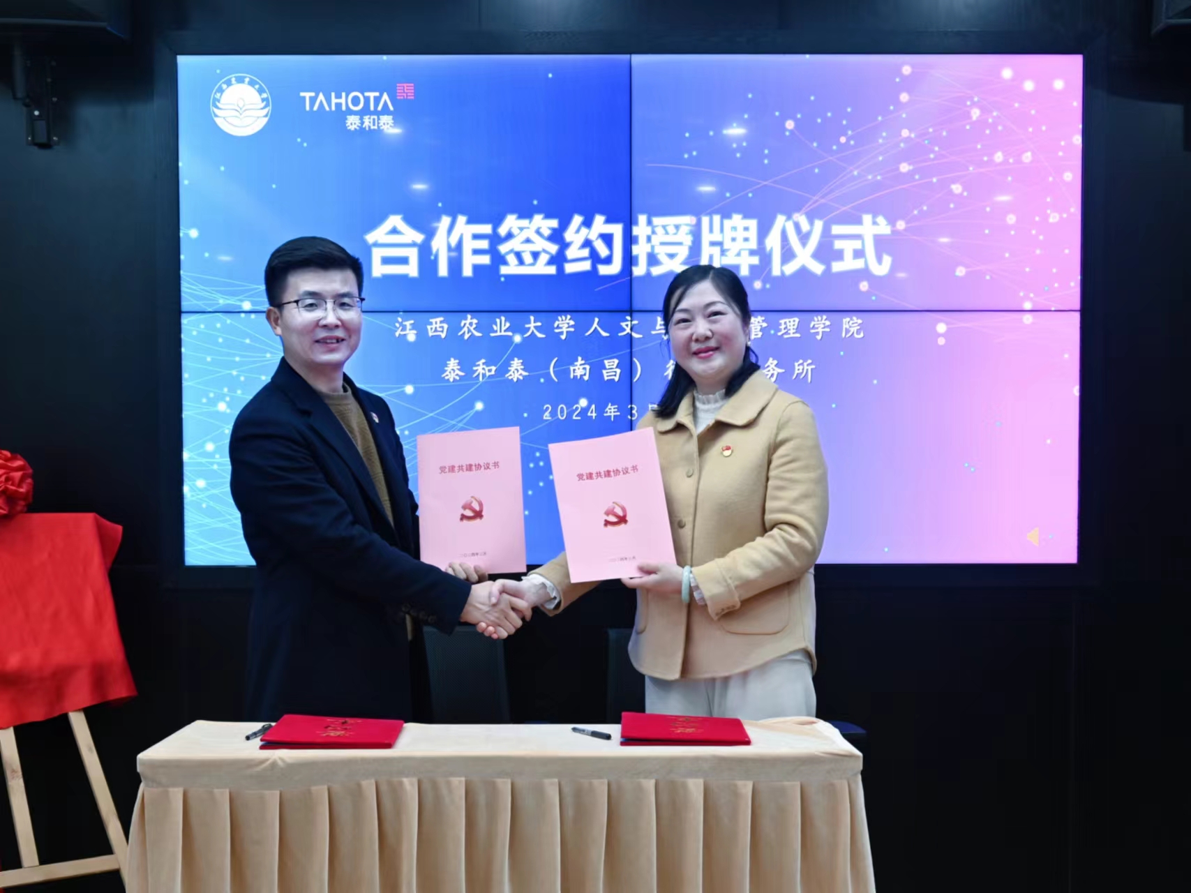 随后,双方就校所党建合作方式、大学生法律实务训练、法学教育、基层法律服务需求等具体合作内容,进行深入交流。在全体与会人员的见证下,双方签署《党建共建协议》《校所合作共建协议》,并共同为“乡村振兴基层治理法律服务实践基地”“江西农业大学实践教学基地”揭牌。