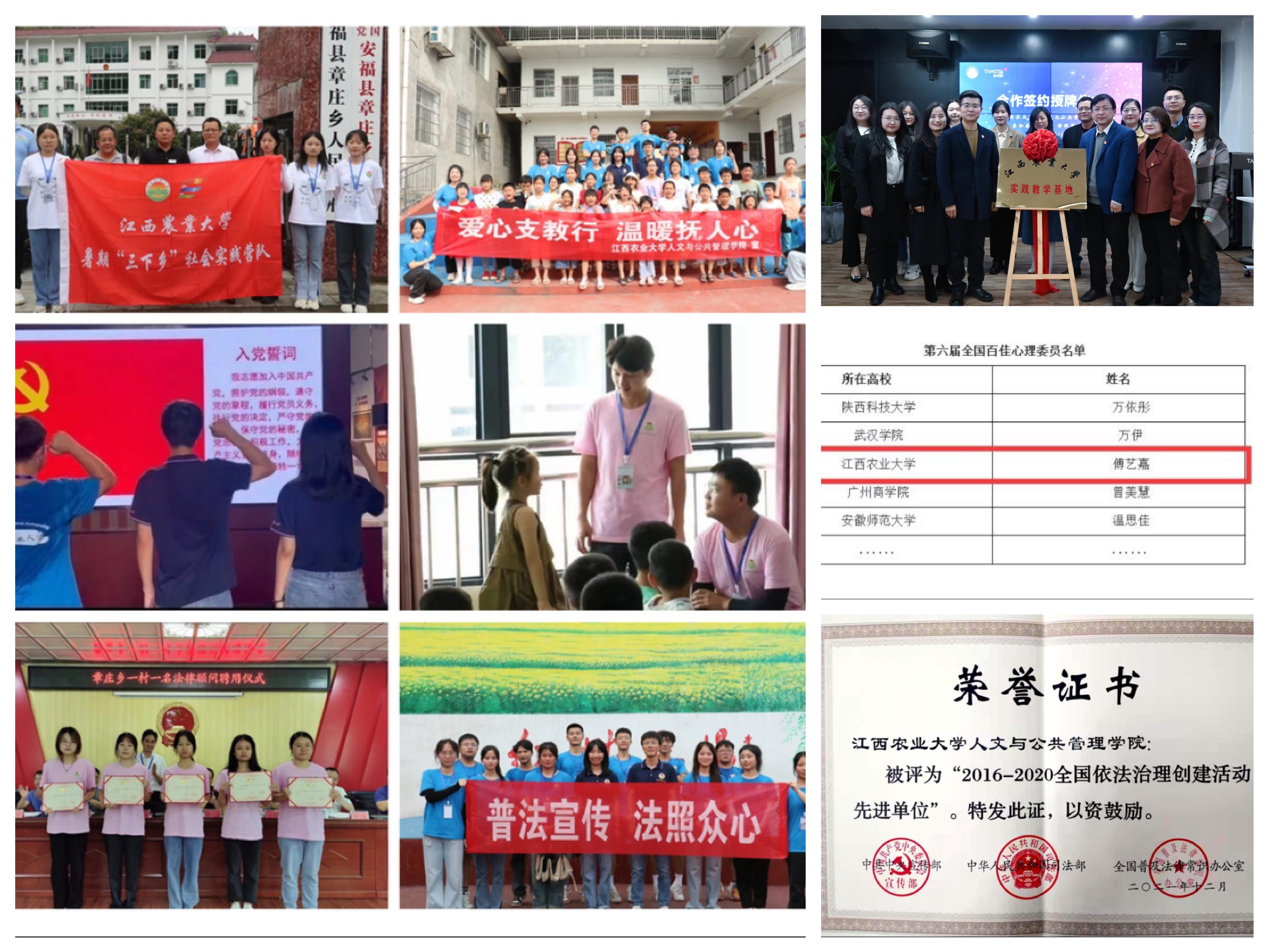 学院重视实践育人,坚持教学同社会实践相结合,坚持教育同服务社会相结合,全面培养德智体美劳“五育并举”的社会主义事业的合格建设者和可靠接班人。大力开展实践教学,在江西日报社、经开十中、经开区法院、泰和泰律师事务所等单位建立实践基地,常态化开展富有成效的教学实习实践活动。每年组织学生开展普法宣传、推广普通话、乡村调查、支教服务、助老助残、关爱留守儿童等社会服务活动,持续开展的“一村一名法律顾问”“法律明白人”培育工程,获评全国大中专学生志愿者暑期“三下乡”社会实践“千校千项”成果“最具影响好项目”、江西省大学生普法联盟宪法宣传教育实践评比活动“一等奖”,被人民网、中国法制周刊等权威媒体多次报道,取得良好社会反响。学院先后获评“全国依法治理创建活动先进单位”、“全国暑期三下乡社会实践活动优秀团队”、“第二届江西省青年志愿服务项目银奖”等荣誉,一批师生获评“全国百佳心理委员”、“全省暑期社会实践先进个人”、“全省优秀志愿者”等荣誉称号。学院连续3年获得学校党团知识竞赛一等奖,大学生志愿协会团支部获评“全国五四红旗团支部”。