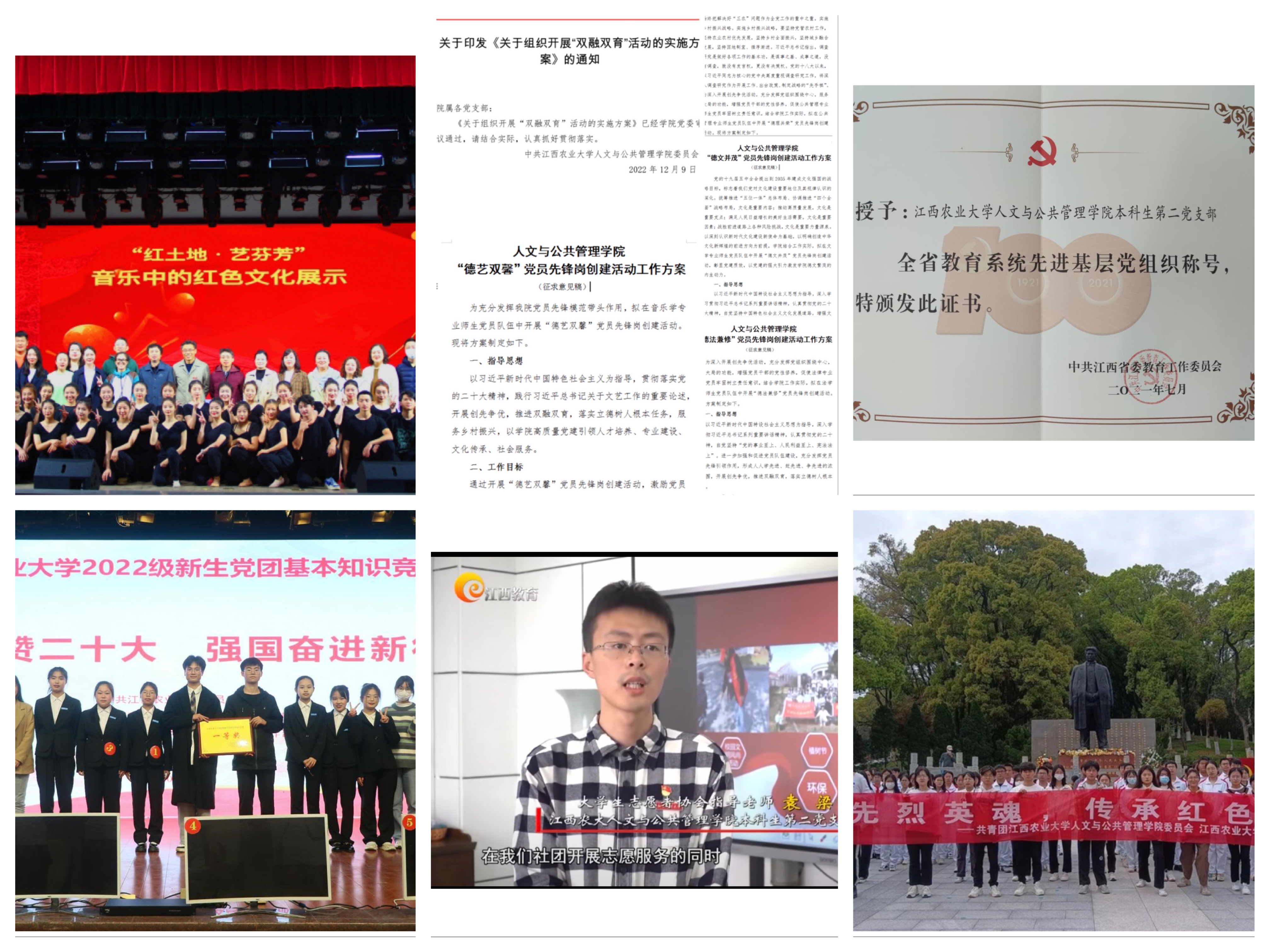 学院党委切实履行党建工作主体责任,把抓好党建作为最大政绩,严格执行党要管党、从严治党的各项决策部署,深入开展“不忘初心、牢记使命”、党史学习教育、学习贯彻习近平新时代中国特色社会主义思想主题教育,始终在思想上政治上行动上同以习近平同志为核心的党中央保持高度一致。牢固树立“党建+”理念,大力打造“党建引领三重奏”品牌,推动党建工作与学院事业发展深度融合,持续开展“我为群众办实事”实践活动。扎实推进党建“三化”建设,建设标准化党员活动室,实施“双带头人”培育工程,建立“双带头人”工作室。深入开展“双融双育”工作,立足专业特色,创新性开展“德艺双馨”“德文并茂”“德法兼修”“德理共荣”党员先锋岗创建活动,师生党员在疫情防控、慰问演出、普法宣传、送教下乡等百次志愿服务活动中冲锋在前,充分发挥了党支部战斗堡垒和党员先锋模范作用,先后获评“新时代赣鄱先锋”“中国大学生自强之星” “全省优秀共青团员”等荣誉,本科生第二党支部获评“全省教育系统先进基层党组织”称号。学院党建特色工作被江西教育电视台《党建好声音》栏目专题报道,党建案例入选省委教育工委编著的《固本强基——江西省高校基层党建工作优秀案例集锦》。