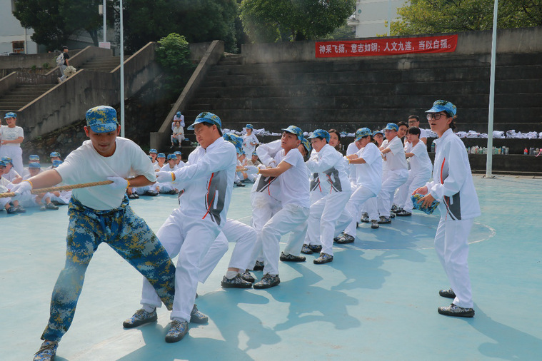 人文关怀浓,团结意志坚。训练期间,学院领导老师来到军训场地亲切慰问新生,激励同学们发扬坚韧不拔、不断超越的精神,以更加饱满的热情、顽强的意志完成军训任务。为进一步激发新生班级团结意识,增进彼此交流,学院于9月24日下午在南区篮球场举办了新生拔河班班赛。比赛过程中,各班参赛队员紧握长绳、咬紧牙关,观赛队友们大声呐喊、加油助威。实力相当的力量碰撞、一鼓作气的瞬间反转,紧张刺激的场面频出,一次次将比赛气氛推向高潮。