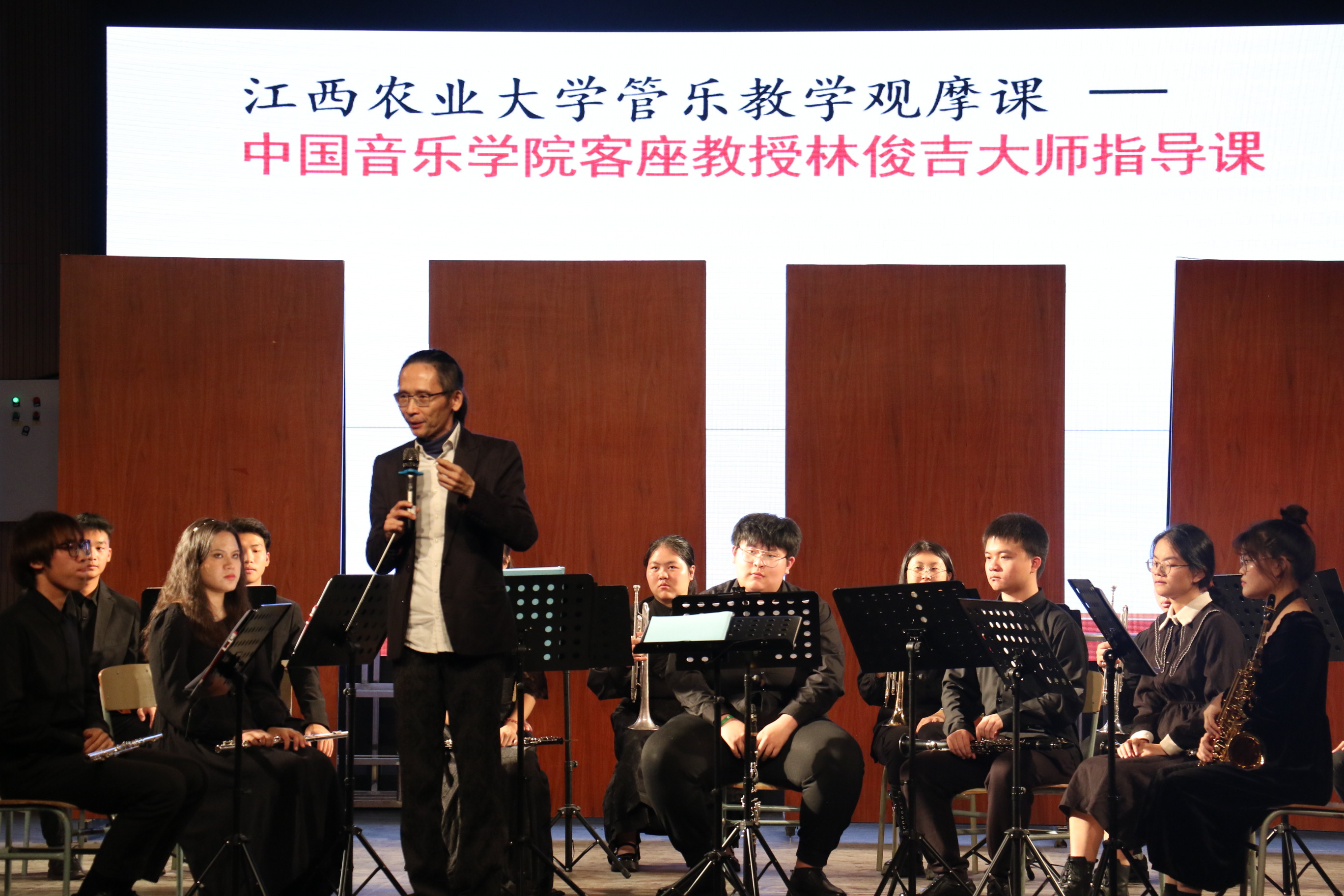 为增进音乐专业学生对管乐器的了解,丰富我院音乐专业教学活动,10月19日晚,中国音乐学院管弦系客座教授林俊吉大师应邀来到我院,为音乐专业学生开展了一堂生动的管乐教学观摩课。院党委书记杨峰、副院长李道和、院团委书记李文瑞、音乐系党支部书记宁欢出席了本次活动,我院音乐学专业学生观摩学习。