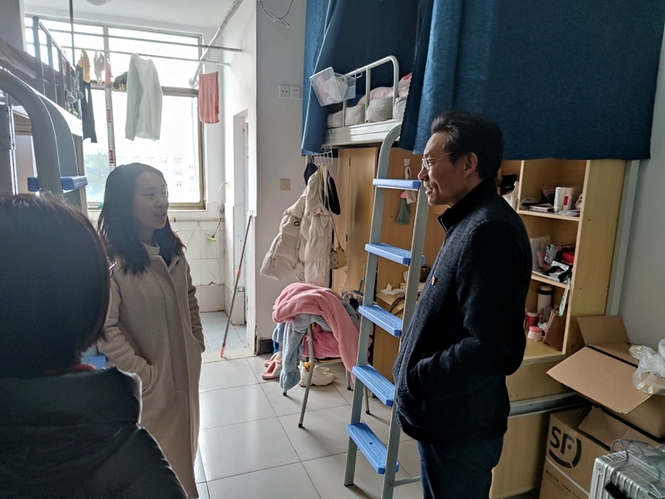 1月28日,在中华民族传统节日春节即将来临之际,学院党委书记杨峰和班主任金怡老师、辅导员袁梁老师一起来到学生宿舍,走访慰问了我院寒假留在学校的同学们。