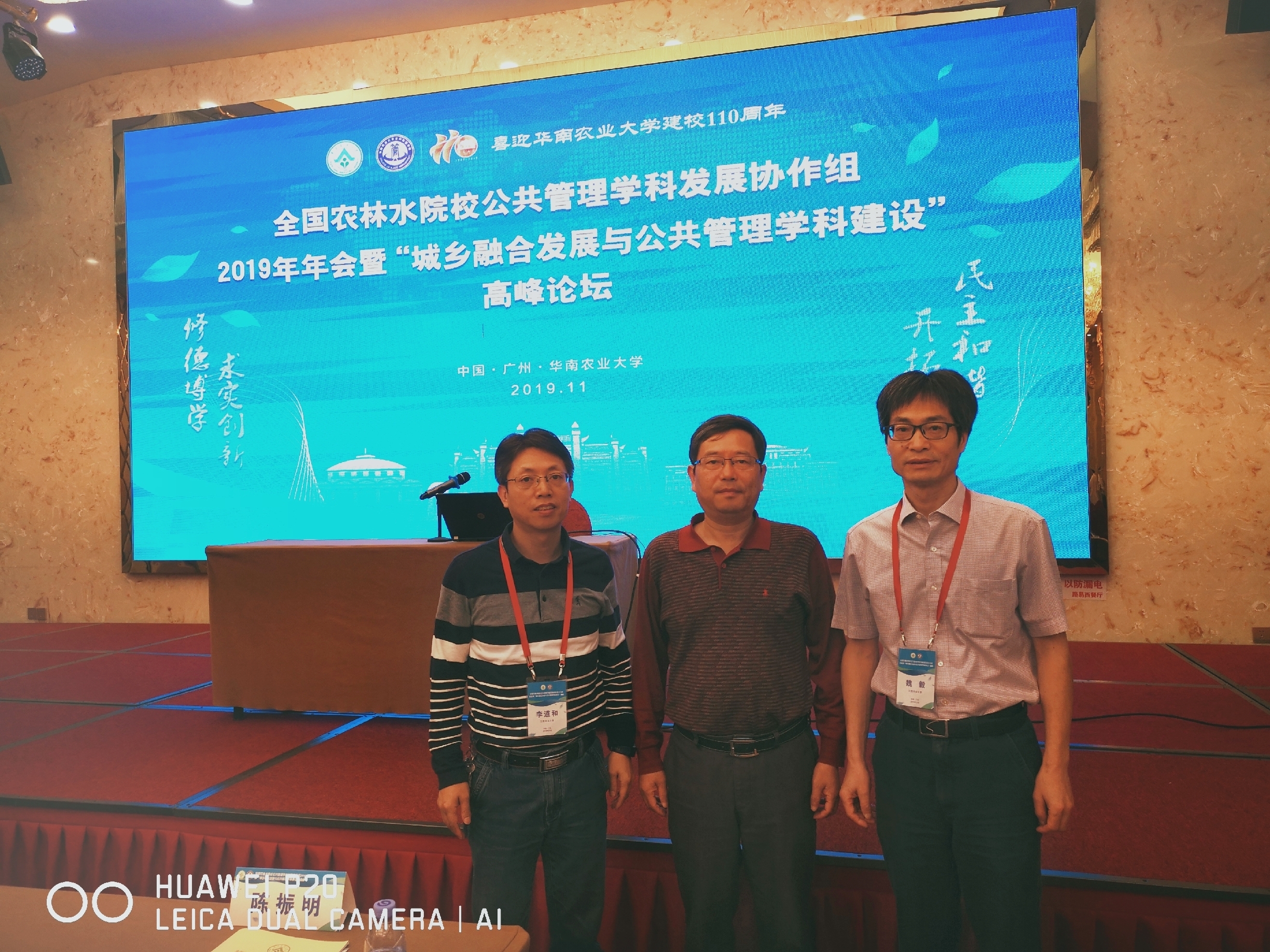 11月1日-3日,我院宋秉斌院长、李道和副院长,教育与经济管理学科点负责人魏毅教授参加了全国农林工作委员会主办,农林工作委员会农林公管协会组、华南农业大学承办的全国农林水院校公共管理学科发展协作组2019年年会暨“城乡融合发展与公共管理学科建设”高峰论坛。