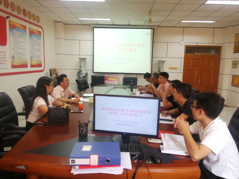 9月25日下午,学校主题教育第三督导组长、校机关党委常委副书记彭小波,校党务政务督查室副主任陈金霞莅临我院进行专题指导,院领导班子成员、各党支部书记参加会议。