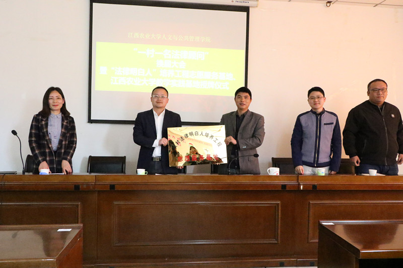在与安福县洋门乡政府的紧密合作下,我院2018年开展的“一村一名法律顾问”暑期社会实践活动取得了圆满成功。为了总结这次活动的经验,开启活动新的篇章,推动全面依法治国的进一步发展,我院于4月1日下午2点半在院办二楼大会议室举行“一村一名法律顾问”换届大会暨“法律明白人”培养工程志愿服务基地授牌仪式。江西省安福县洋门乡乡长董辉、院领导和老师共同出席本次会议。