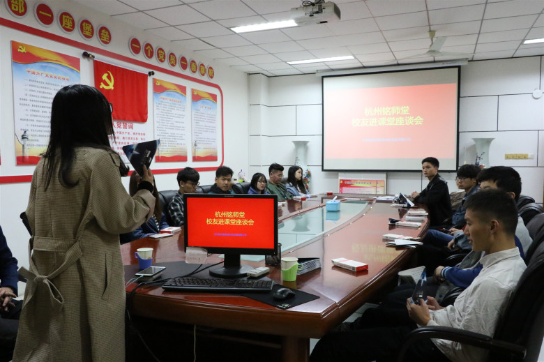 本次座谈会的主讲人是在杭州铭师堂教育公司工作的校友,她简单叙述了自己在校期间的经历,以及进入铭师堂公司后逐步成长成为中层管理干部的历程。之后,易娇校友为学生们播放了相关纪录片,并且热情回答了到场学生提出的问题。最后,铭师堂人力资源负责人吕晓芳作了总结,鼓励在场学生积极准备,参与学校举办的专场招聘,并祝愿大家都能走上自己理想的职业道路。