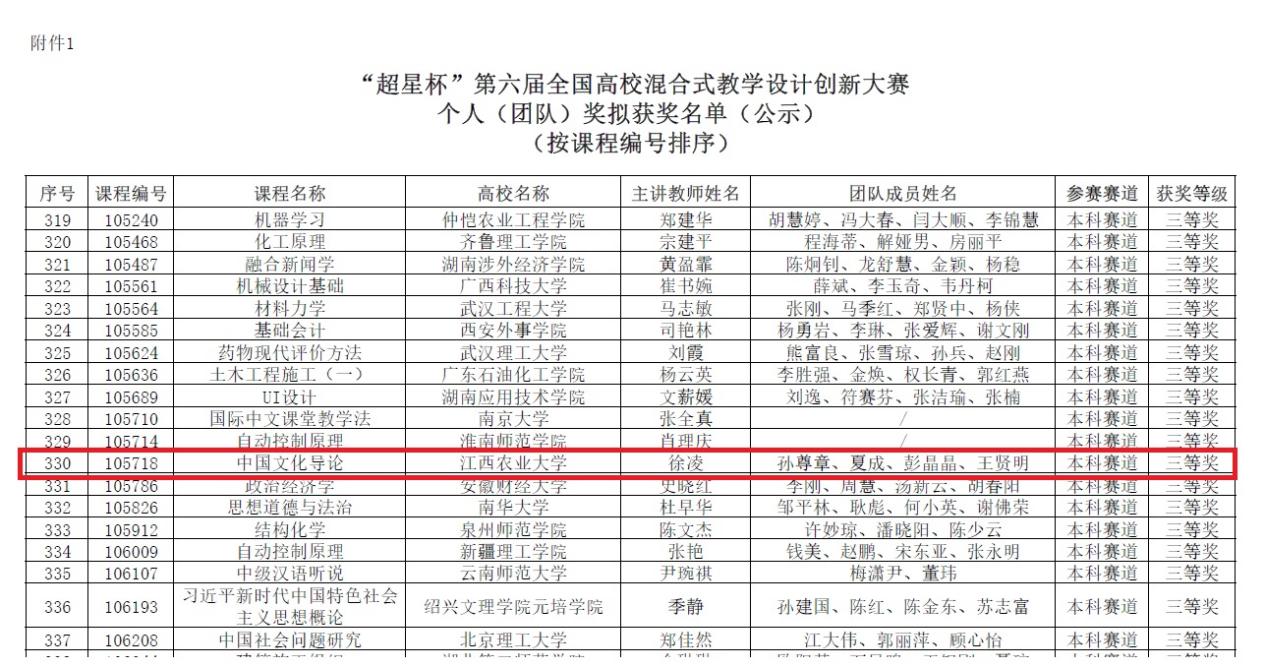 12月29日,“超星杯”第六届全国高校混合式教学设计创新大赛在西安电子科技大学落下帷幕。我院徐凌老师主讲的“中国文化导论”课程(团队成员:孙尊章、夏成、彭晶晶、王贤明)荣获大赛三等奖。全国高校混合式教学设计创新大赛致力于挖掘、培育并展示教师混合式课程建设及教学设计成果,促进高校数字化教育教学改革。本届大赛共有包括清华大学、上海交通大学等全国415所高校(本科院校351所,高职院校64所)参赛。大赛已被中国高等教育学会纳入《全国普通高校教师教学竞赛分析报告》及《全国普通高校教师教学发展指数》的数据统计范畴,成为衡量高校教师教学发展生态的一个重要标尺。