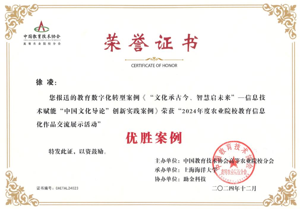 12月29日,中国教育技术协会高等农业院校分会公布了2024年高等农业院校教育信息化作品交流展示评选结果,徐凌老师设计的“‘文化承古今、智慧启未来’——信息技术赋能‘中国文化导论’创新实践案例”和孙尊章老师主讲的“汉字与农耕文化”微课视频(团队成员:徐凌、夏成、彭晶晶),分别荣获2024年高等农业院校教育信息化作品交流展示评选活动“教育数字化转型优胜案例”和“优秀微课作品”。此次展示活动由中国教育技术协会高等农业院校分会主办,旨在贯彻落实国家数字中国建设和教育数字化战略行动部署,加快推进农业高校教育数字化转型和智能化升级,促进信息技术与教育教学融合创新。这两项获奖,是我院教育信息化成果的体现。