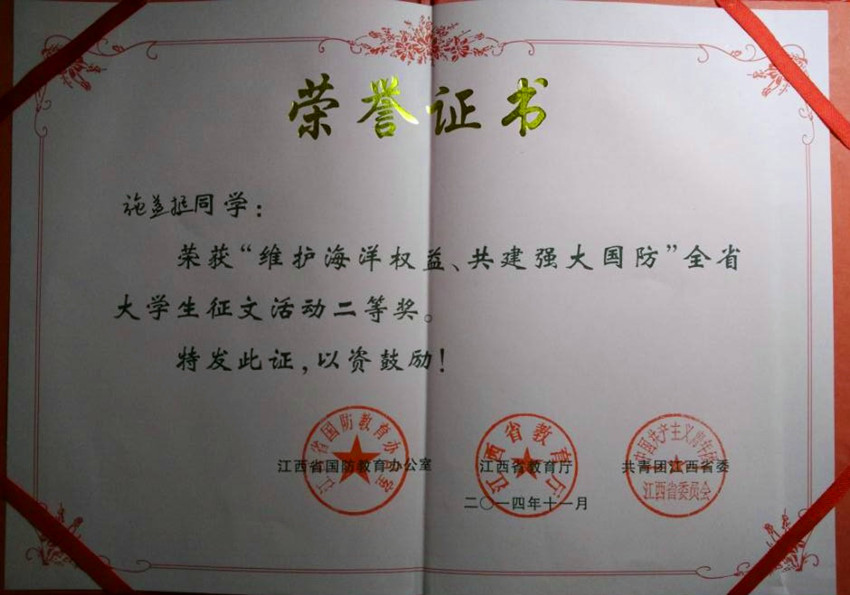 热烈祝贺我院法学1301班施益挺同学在“维护海洋权益,共建强大国防”全省大学生征文活动中获得二等奖。