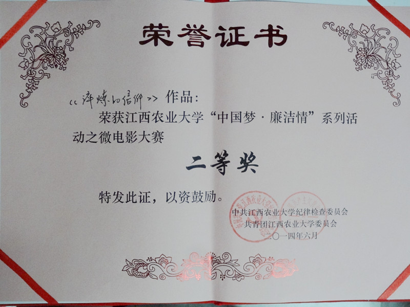为营造以廉为荣、以贪为耻的校园风尚,大力推进校园廉政文化建设,6月12日,由中共江西农业大学纪律检查委员会和共青团江西农业大学委员会共同主办,江西农业大学党风廉政建设学生信息部承办的“中国梦.廉洁情”微电影大赛决赛在校办隆重举行。校党委宣传部部长黎瑛、党办校办副主任周艺萍、工会主席王兰、党校常务副校长刘正和、离退休干部处处长兼组织部副部长黄小珊、校团委书记高鹏、我院中文教研室副教授陈旭鑫作为评委莅临本次比赛现场。校纪委书记白浔、校纪委副书记兼监察室主任曾卫明、监察室副主任戴红波作为嘉宾也观看了本次比赛。