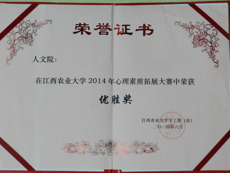 近日,学校颁发了2014年“5·25”心理健康月活动各类奖项,作为学校14个参赛学院之一,我院选手在“一圈到底、八人九足、穿越电网、袋鼠赛跑”四个项目中团结协作、奋勇向前,摘得团体优胜奖。(宣传部 管璐璐)