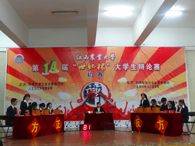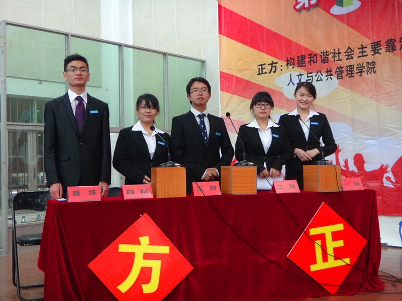 11月18日,第十四届“世纪杯”辩论赛第八场在大学生活动中心501顺利举行。我院(正方)与生工院(反方)围绕“构建和谐社会主要靠法制还是德治”辩题展开激烈辩论。校纪委综合办公室主任胡永华、校团委副书记郭军海、马克思主义政治学院罗忆芳、傅琼老师和第十三届世纪杯优秀辩手何芮担任本场比赛评委。
