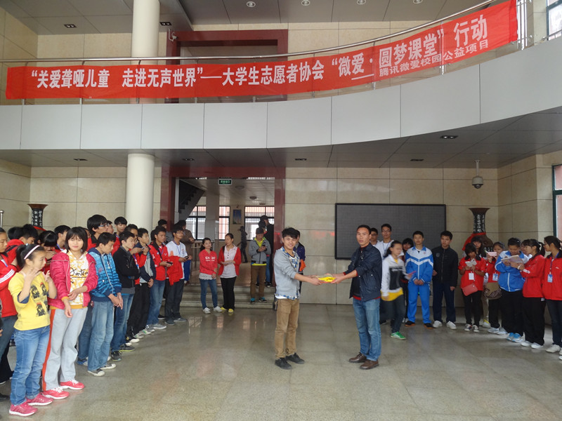 为发扬志愿精神,提高志愿者协会影响力,呼吁社会更多爱心人士加入到志愿服务队伍中来,根据前期申报的2013年腾讯微爱项目计划,11月10日我院大学生志愿者协会在院团委老师宋琳的带领下赴南昌启音聋哑儿童学校开展“微爱·圆梦课堂”行动。
