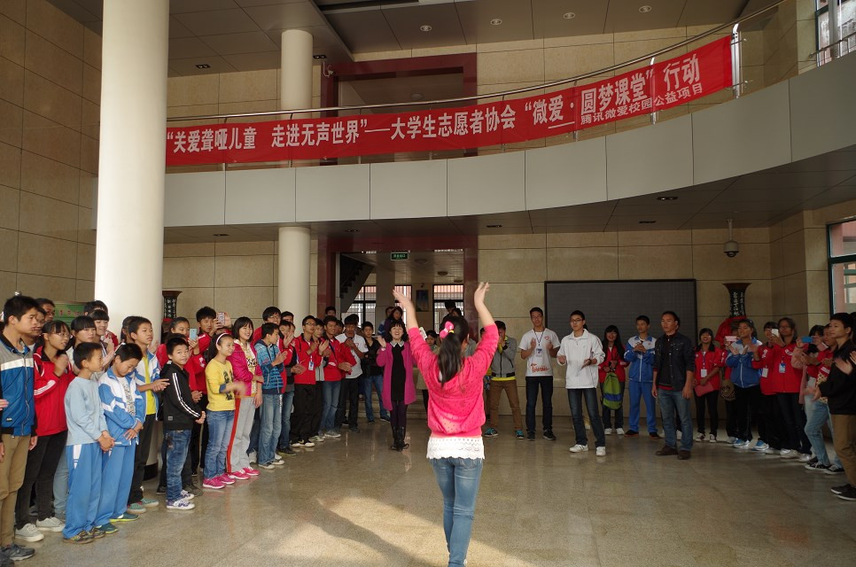 继腾讯微爱校园公益项目——“微爱·圆梦课堂”简短捐赠仪式后,志愿者代表们为启音聋哑儿童表演手语版《和你一样》,表达了对孩子们的祝福;接着启音聋哑儿童也带来他们精心准备的群舞、独舞等精彩舞蹈演出,随后各课堂小组负责人将孩子们带到教室进行授课,并在操场进行户外互动游戏。整个志愿服务过程中,志愿者耐心与孩子们在笔记本上写字交流。