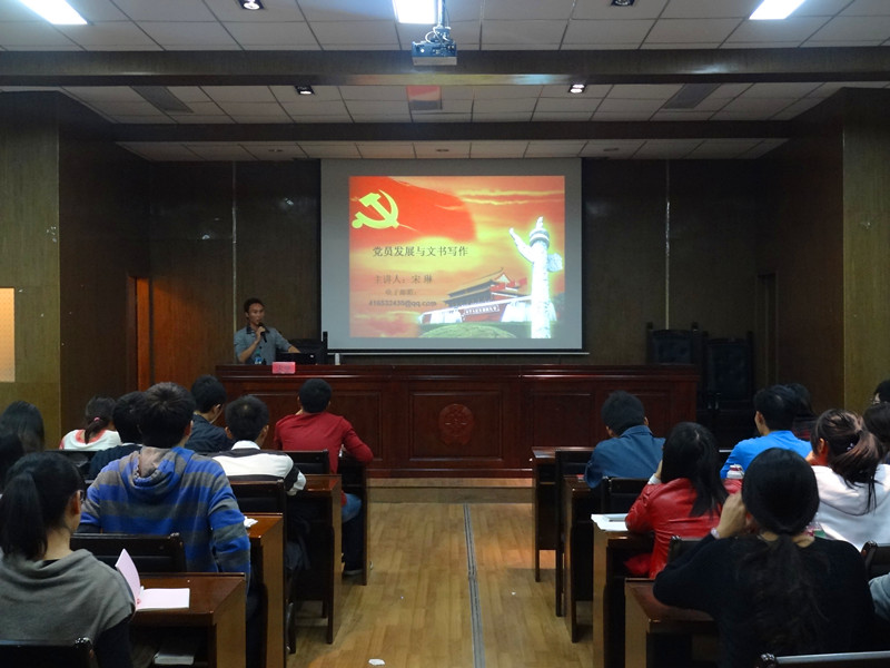 10月29日,以“学党章、知党史、强党性,践行强大中国梦”为主题的系列教育活动之“党员发展与文书写作”专题讲座在院办504顺利进行。本次党课培训由团委老师宋琳主讲。