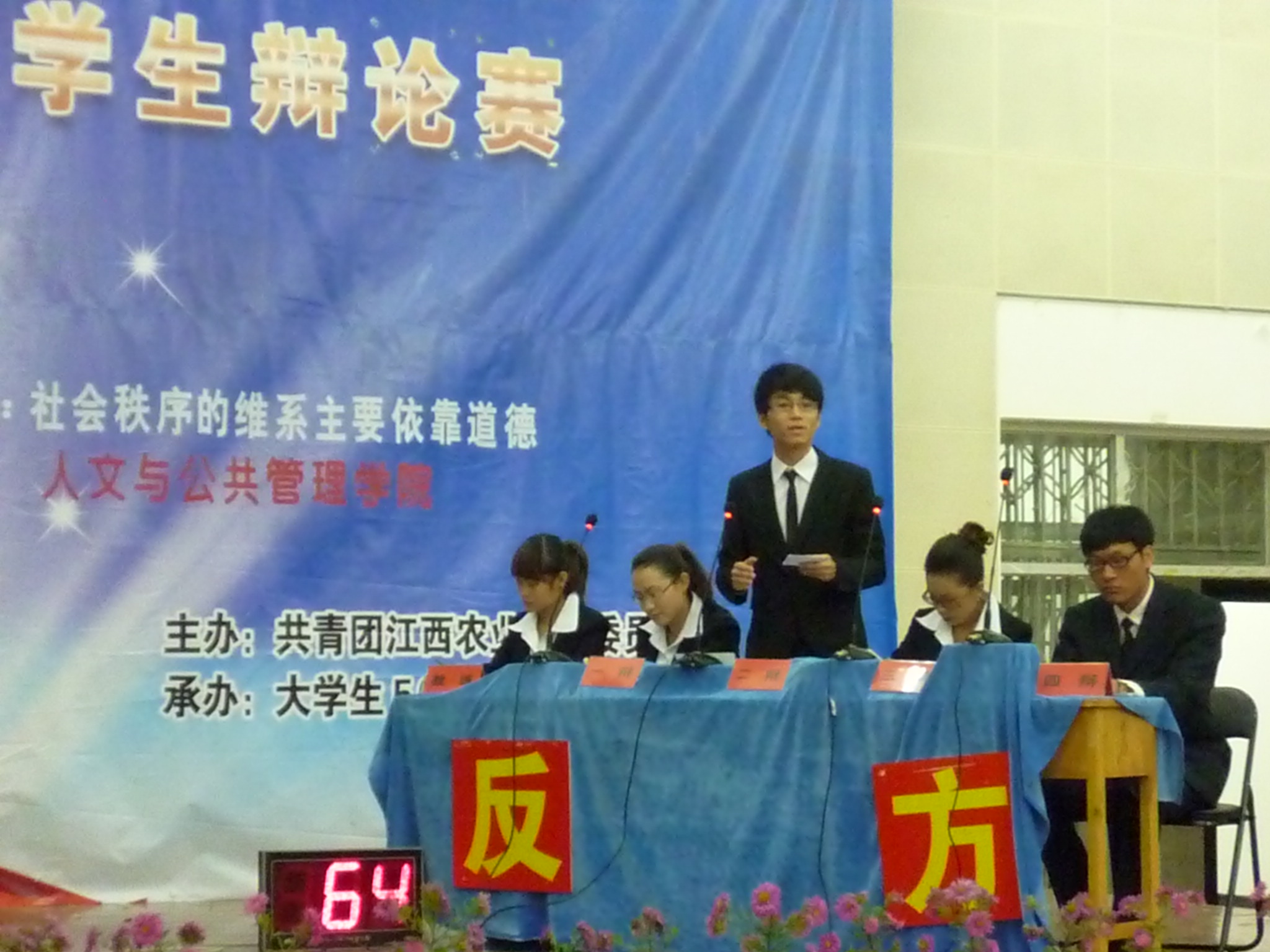 11月24日晚7点,第十二届“世纪杯”大学生辩论赛第二场半决赛在大学生活动中心501拉开序幕,我院(反方)和理学院(正方)围绕“社会秩序的维系主要依靠法律还是道德”展开了精彩的辩论。