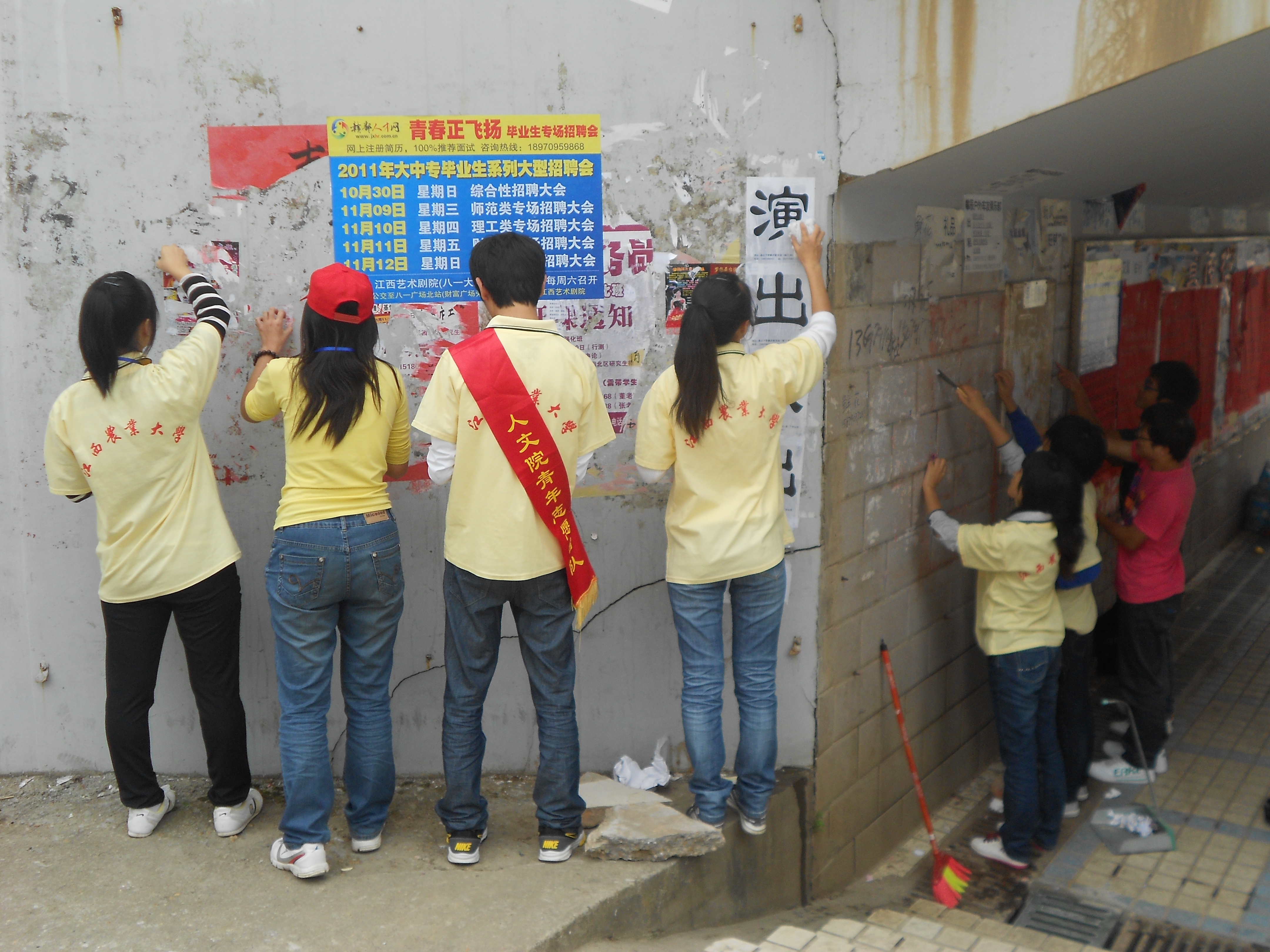 11月6日,我院青年志愿者深入校园角落,开展清除“牛皮癣”及清扫校园死角垃圾活动。志愿者们对地下通道违规张贴的广告及翠湖边上的垃圾进行了清理,使校园周边环境焕然一新。