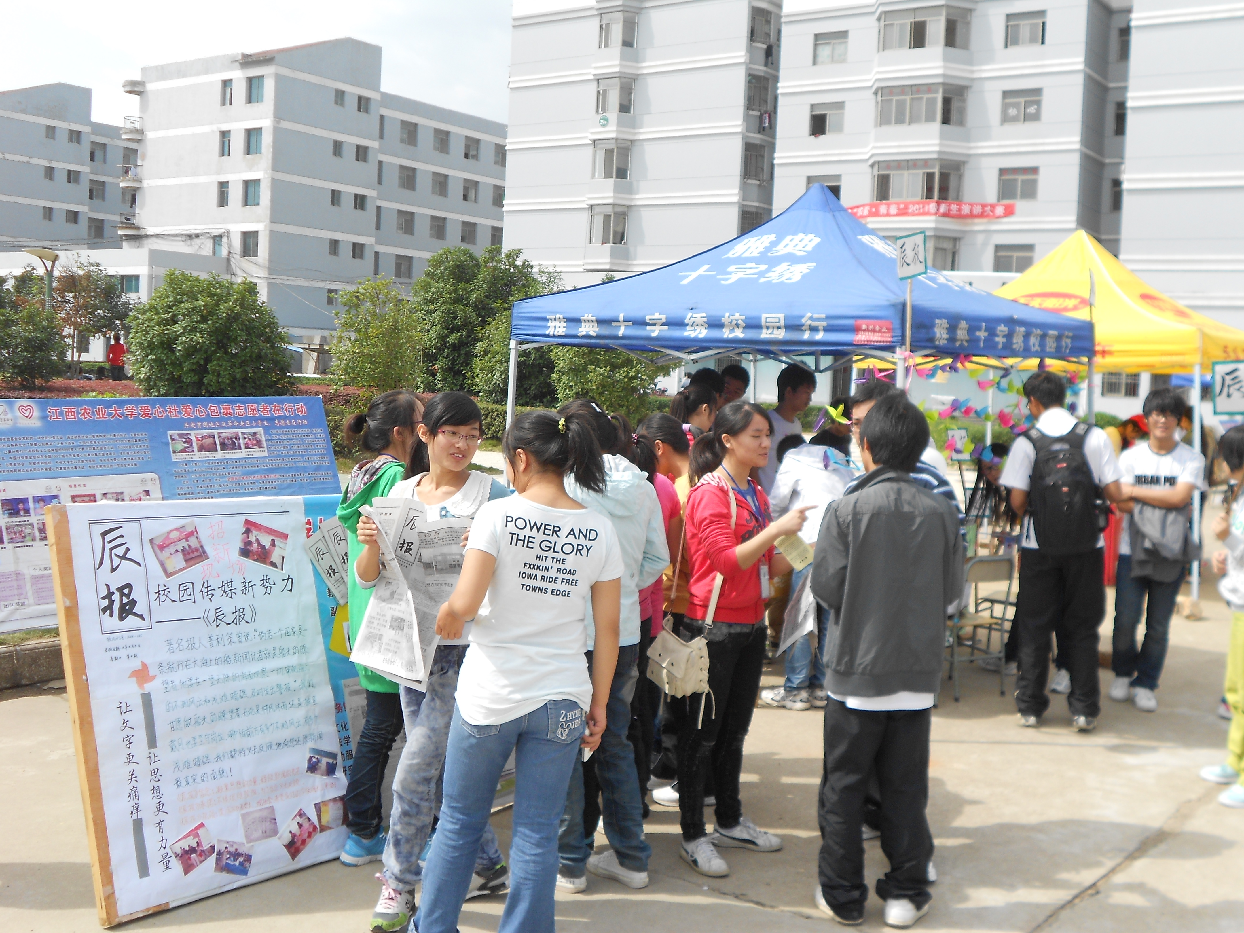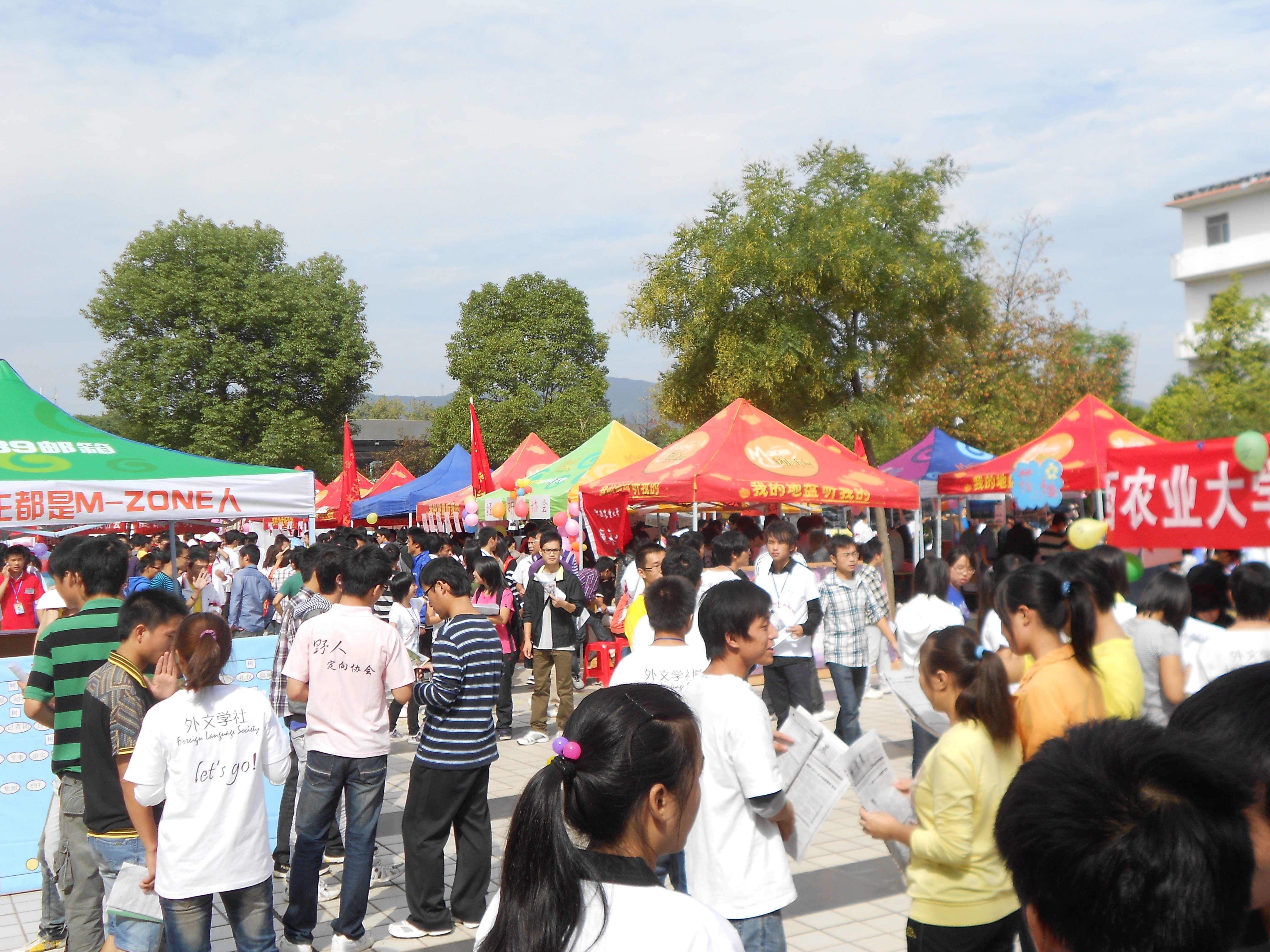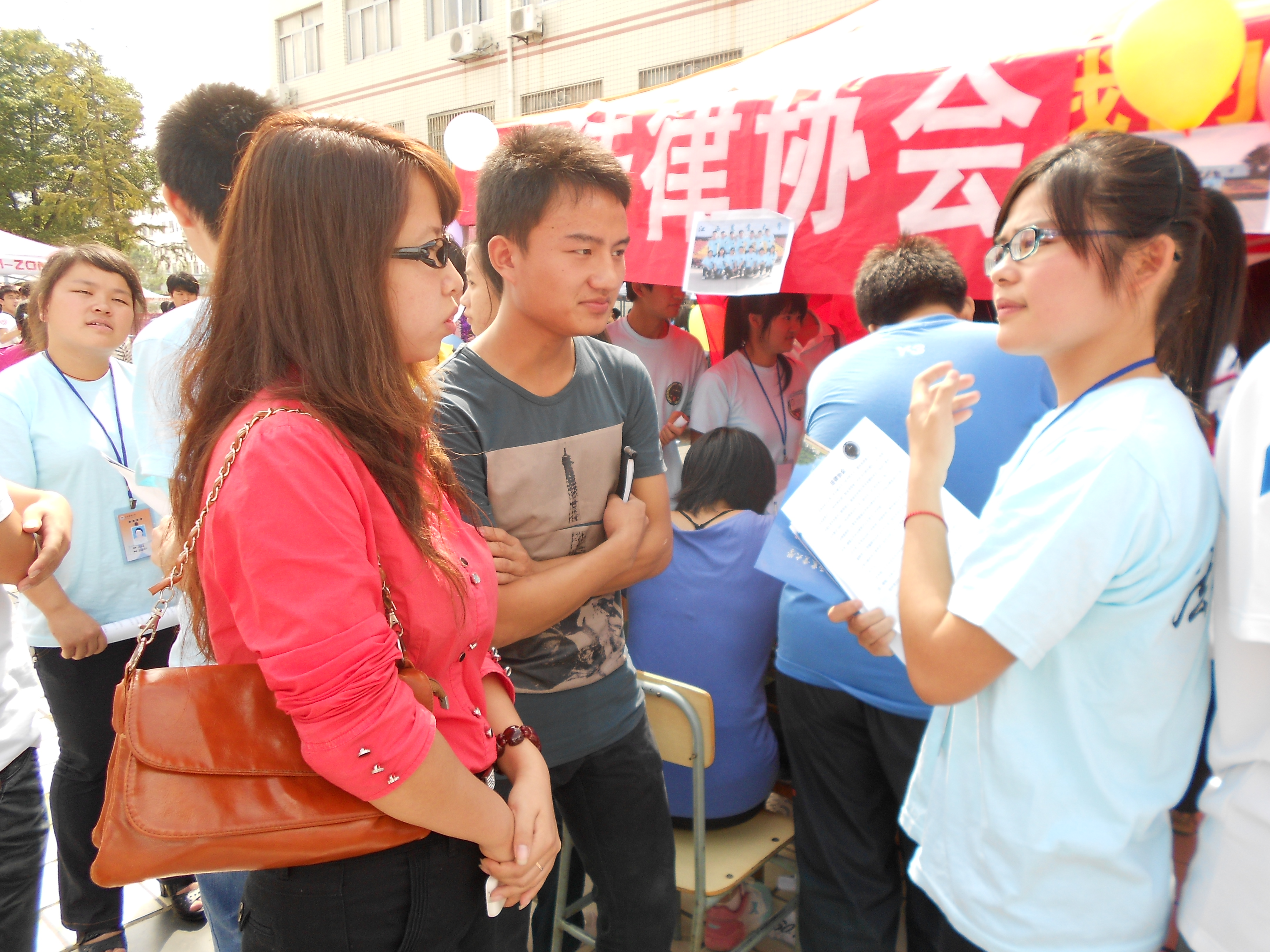 江西农业大学一年一度的学生社团招新活动于2011年10月15日在大学生活动中心正式拉开帷幕。社团联合会携手60多个学生社团同时进行统一招新,其中有来自人文与公共管理学院的5个社团——《辰报》、《飞白》报社、法律协会、人文乐舞和雅风艺术团。人文学院团委刘琳老师和几个委员来到招新现场感受热闹氛围。