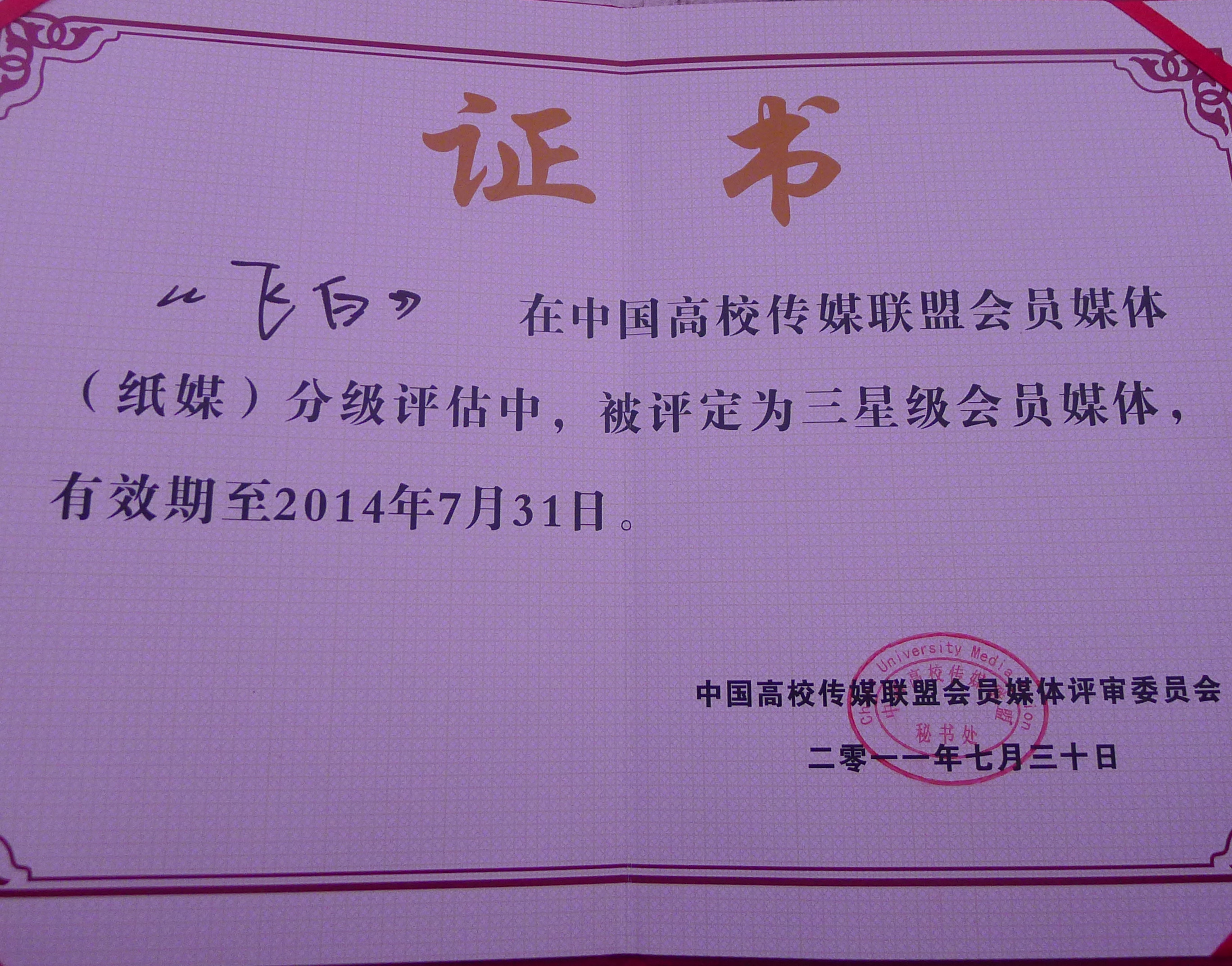 从2011年4月初到6月,在经过自评问卷、联动采访、寄送申报材料、主席团专家组评定等环节后,江西农业大学《飞白报》与华东理工大学《新风报》成功荣获中国高校传媒联盟“三星级会员媒体”,江西财经大学《品报》荣获“四星级会员媒体”,是江西省高校媒体中此次唯一获得“国家级”荣誉的三家媒体。并于7月31日发放了此次奖项的荣誉证书。中国高校传媒联盟还将依据分级评估结果,设立系列校媒扶持计划,包含“校媒发展基金”、“校媒主编培训班”、“与世界对话”、“未来讲堂”等。三星级以上会员媒体可提出申请。