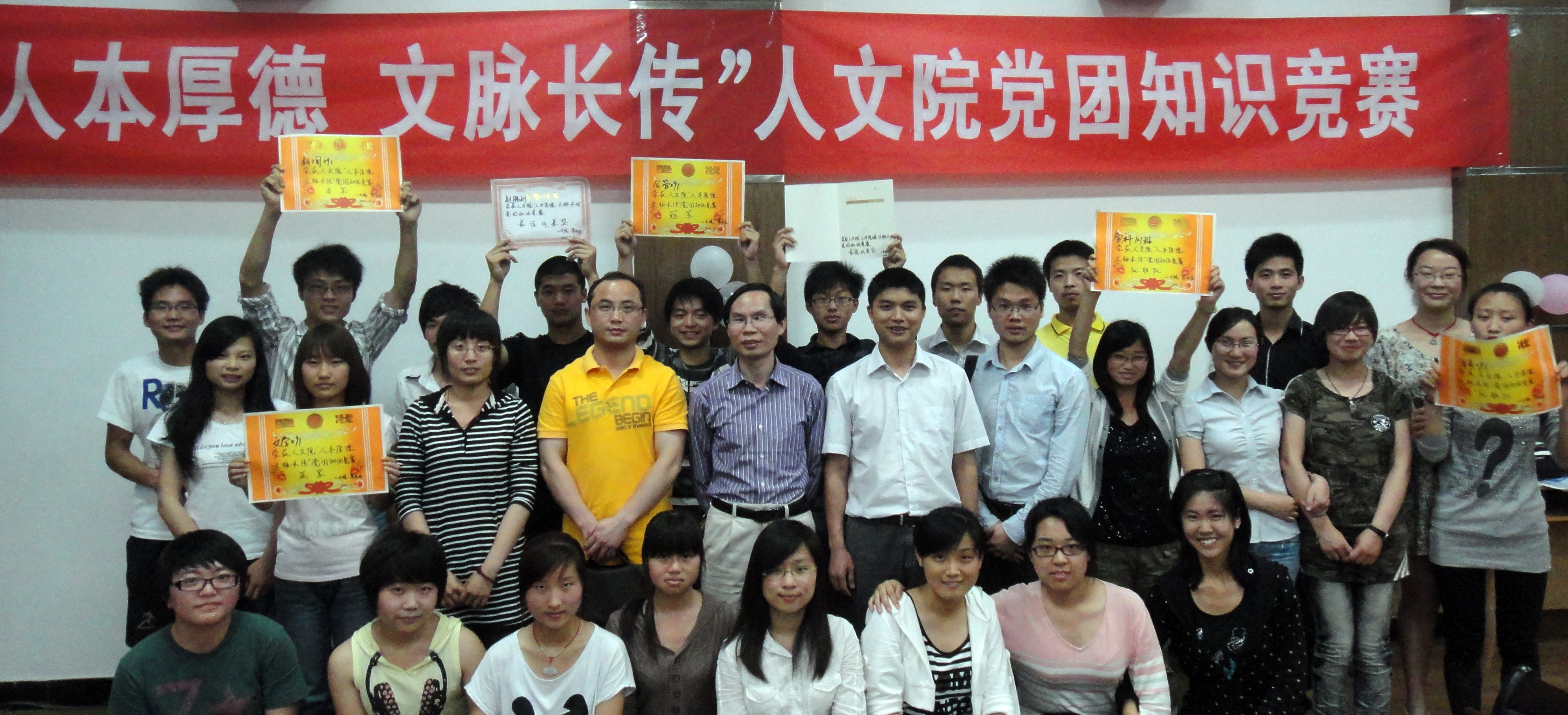 值中国共产党成立九十周年之际,为让学生进一步加深对党团知识的了解,感怀党的恩情,传承党的文明,同时丰富学生课余生活,加强学生和班级间交流合作,多途径激发学生学习兴趣。5月11日,人文学院党委主办,学生会承办的以“人本厚德,文脉长传”——人文学院党团知识竞赛为主题赛事活动。人文学院党委书记郭如良、党委副书记王志发、团委书记陈小志和团委指导老师蔡火凤等五位老师担任了比赛的评委。