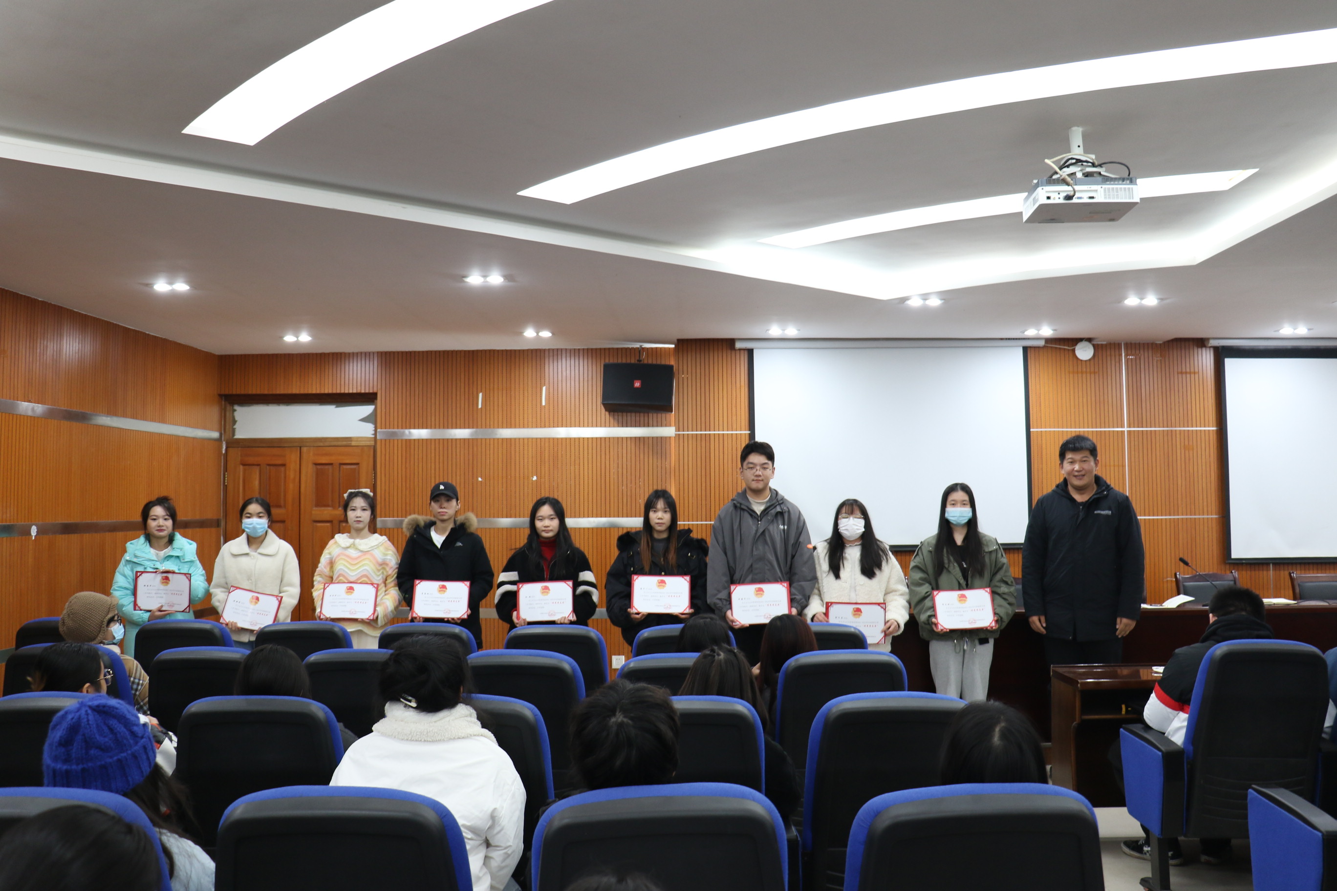 在基层团组织与团干部工作考核表彰会上,两位老师为邹慧平等九位2021-2022学年“优秀团支书”,陈雪萍等12位2021-2022学年“优秀组宣委员”颁发证书并合影留念。获奖代表们在随后的发言中总结了个人履职经历与工作心得,并纷纷表示将秉持严谨细致的态度,发挥团结引领青年学生的积极作用。