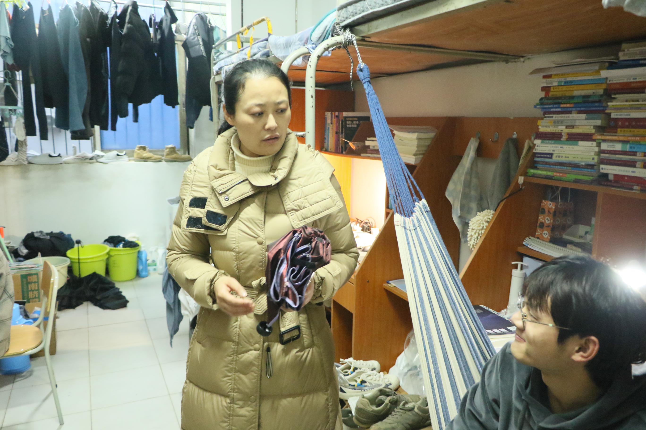 3月11日晚,我院党委副书记刘彩云带领政治辅导员“兵分多路”走进学生寝室。她走访了我院2018级男生寝室,和同学们进行亲切交谈。她既提醒大家应该多花时间对待自己的寝室卫生,又认真询问大家的目标和规划。她说到:“大三是大学四年关键的节点,希望每一位同学有清醒的规划,树立明确的目标,为之不顾风雨地努力奋斗。”