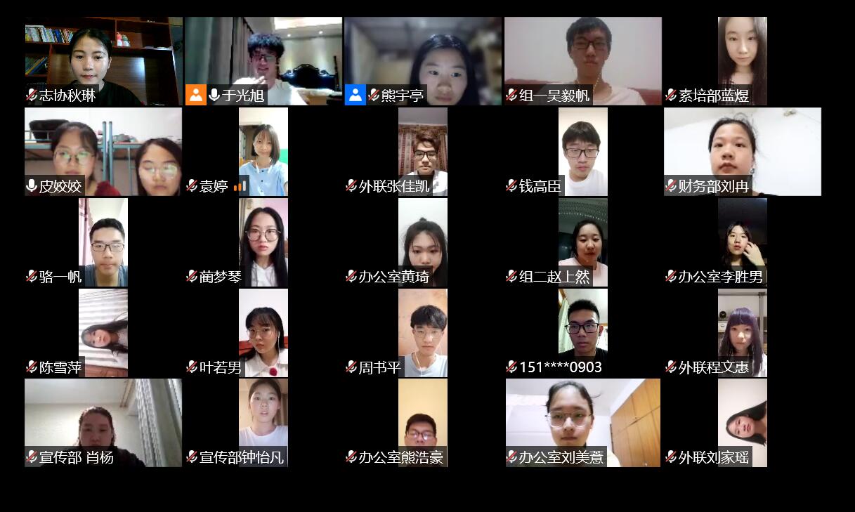 为积极响应党的十九大以来关于“广大志愿者和服务组织要立足新时代、展现新作为”的号召,进一步提高协会及成员奉献友爱、互助进步的思想意识,弘扬大学生志愿精神,7月5日晚,我校大学生志愿者协会在线上举行了第八届年度总结大会,全体志协成员参加会议,负责人助理于光旭主持会议。