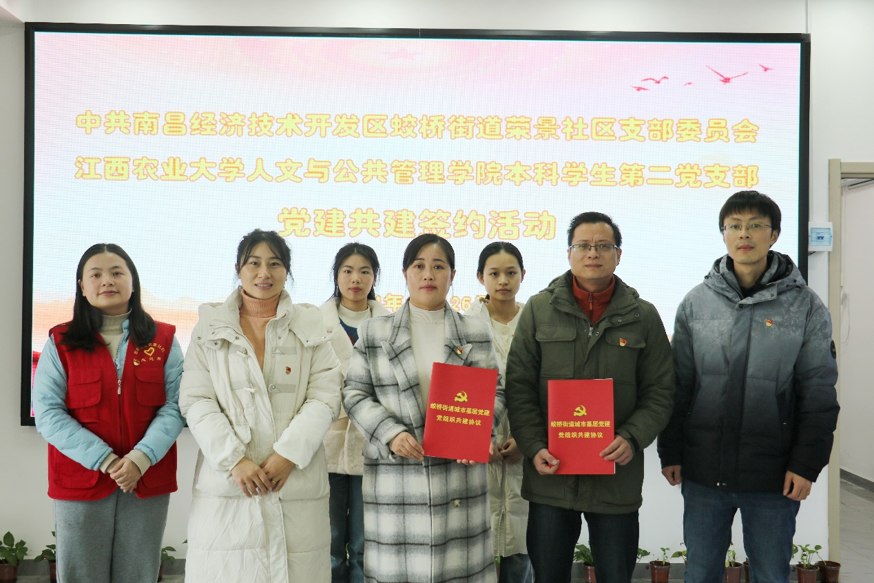 为加强我院党支部建设,提高党建工作水平,12月26日上午,我院本科学生第二党支部与荣景社区支部委员会支部党建签约活动于荣景社区顺利举行。院党委副书记曹人龙,院团委副书记、本科学生第二党支部书记袁梁,荣景社区党支部书记王元元等参加本次签约活动。