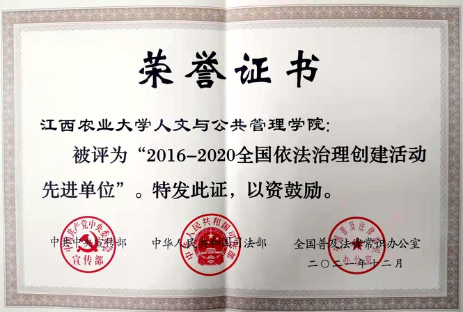 近日,中宣部、司法部、全国普法办联合发文,对2016至2020年全国普法工作先进单位、先进个人和依法治理创建活动先进单位进行表彰,我校人文与公共管理学院名列榜上,荣获全国依法治理创建活动先进单位。