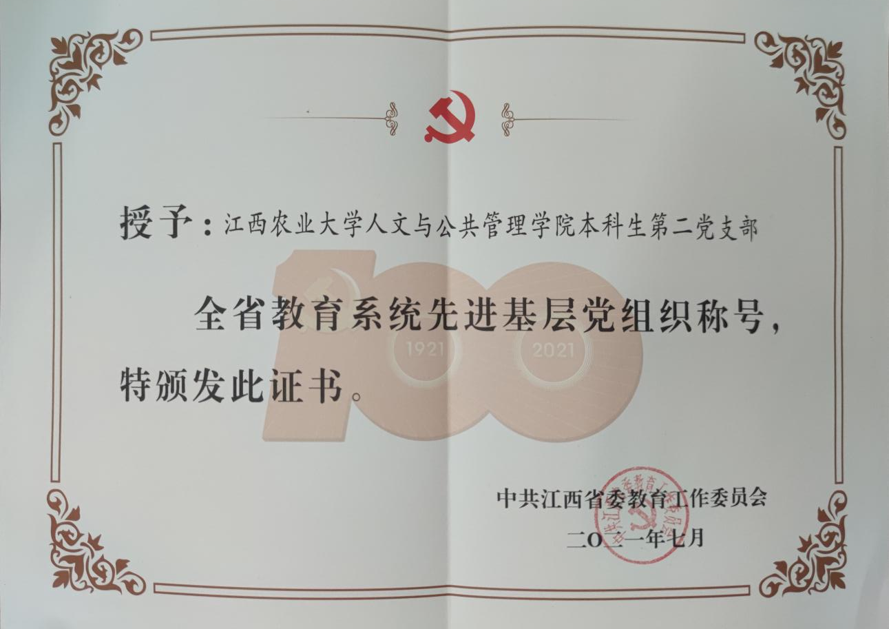 近日,从中共江西省委教育工作委员会传来喜讯,我院本科生第二党支部在2021年度江西省“两优一先”评选中,被评为“全省教育系统先进基层党组织”。