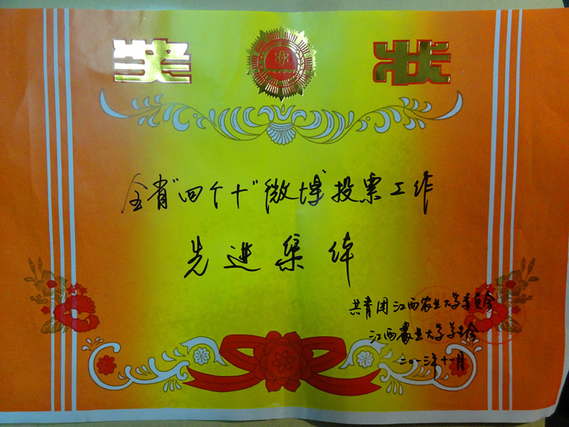 10月27日微博投票评选开始,在为期11天的腾讯微博投票活动中,我院积极参与为“环境教育与公众参与”活动、江西农业大学学生会、农学院团委、国土资源与环境学院旅游管理1101班团支部投票。在各个年级、班级中广泛宣传,动员全院师生参与到“四个十” 投票评选活动,投票超过五千,超额完成要求,获得校团委颁发的“全省共青团高校‘四个十’微博投票工作先进集体”荣誉称号。(宣传部 刘旻慧 管璐璐)