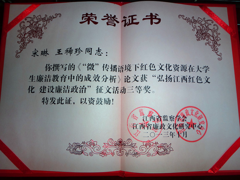 近日,在江西省监察学会、江西省廉政文化研究中心联合举办的“弘扬江西红色文化,建设廉洁政治”征文比赛中,我院教师宋琳、学生王稀珍两人撰写的《“微”传播语境下红色文化资源在大学生廉洁教育中的成效分析》荣获本次征文大赛三等奖。