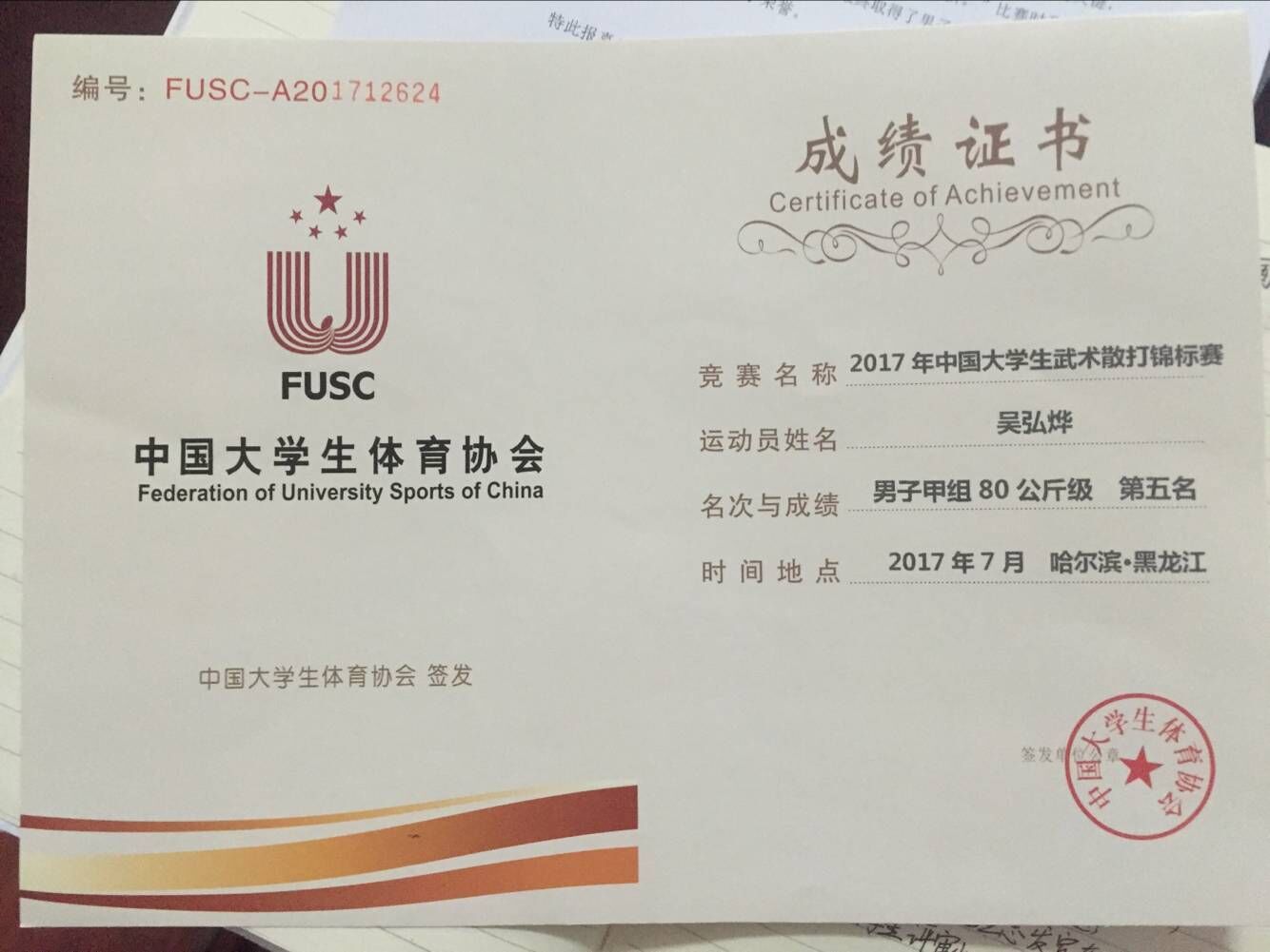 2017年7月13日至20日期间,由中国大学生体育协会主办、黑龙江省体育局承办的2017圣德杯全国大学生武术散打锦标赛在哈尔滨黑龙江大学成功举办。我院公共事业管理1401班的吴弘烨同学参赛,并荣获男子甲组八十公斤级第五名的优异成绩。