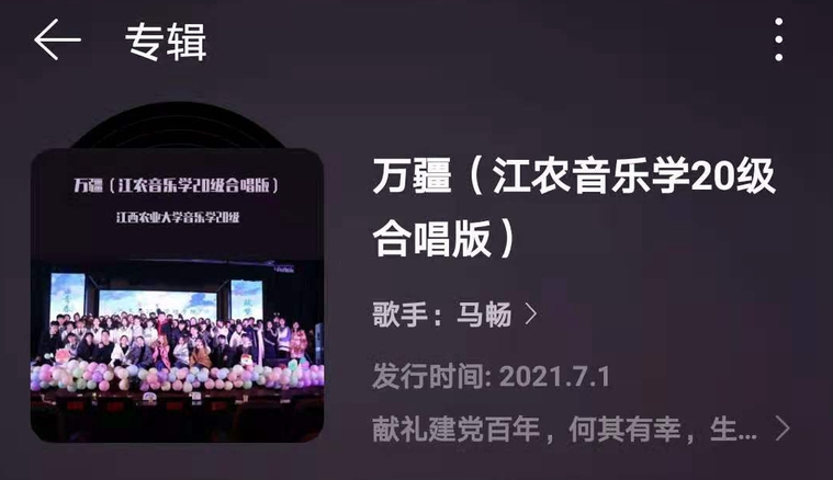7月1日,在全国上下庆祝中国共产党成立一百周年的日子里,有这样一首歌曲在江农人的朋友圈里刷屏,那就是来自音乐学2020级全体同学翻唱的歌曲《万疆》。该演唱版本由我院音乐学2020级的班主任马畅老师和曹俊健、刘品赫、刘旭、梁原烽、张贻娟、汪镜垚等学生主唱,发挥专业特点,以歌咏志,以艺传情,献礼建党百年。