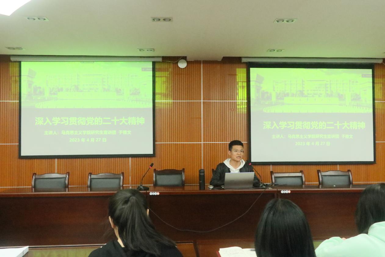 为深入学习贯彻党的二十大精神,扎实推进主题教育,4月27日晚,我院于院办109举行“深入学习贯彻党的二十大精神”宣讲会。宣讲会邀请马克思主义学院习近平新时代中国特色社会主义思想研究生宣讲团成员于雅文担任主讲,我院政治辅导员和全体学生三个学生支部全体党员参加学习。