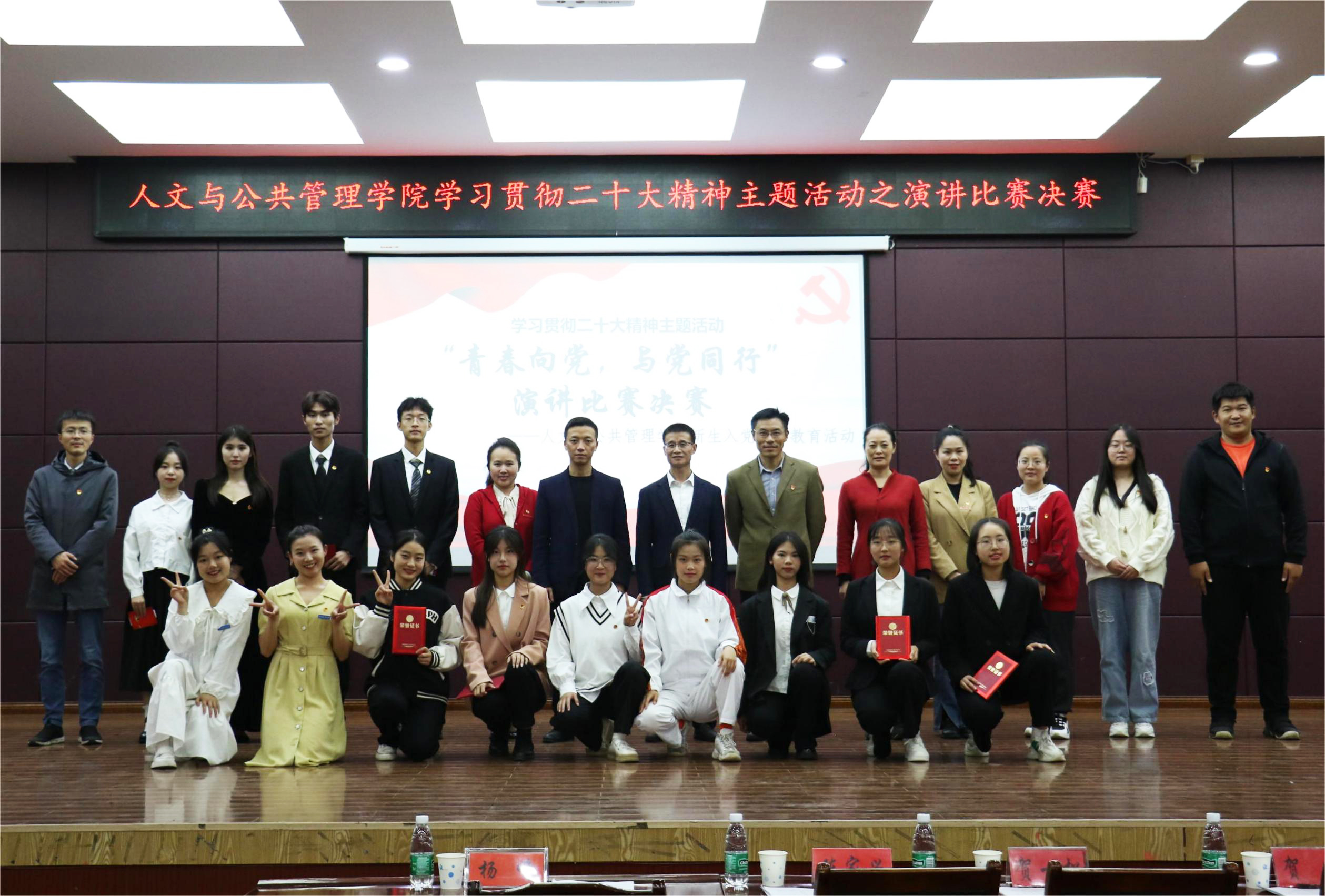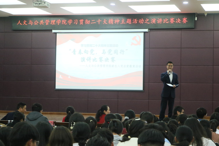 1028日晚,我院“青春向党,与党同行”——学习宣传党的二十大精神主题演讲比赛决赛在大学生活动中心501举办校党委委员、宣传部部长贺一松、党委组织部副部长陈家兴、团委副书记贺媚出席本次活动并担任评委,院党委书记杨峰、党委副书记刘彩云、学院政治辅导员和2022级全体学生共同观看了本次比赛。