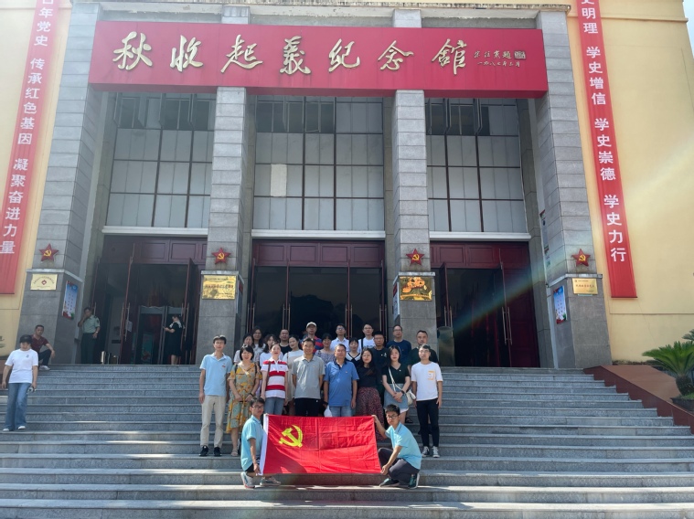 “军叫工农革命,旗号镰刀斧头,匡庐一带不停留,要向潇湘直进。”毛泽东在起义途中写下了这首《西江月·秋收起义》。为了亮出“我们应高高打出共产党的旗子”的鲜明立场,秋收起义打出了我党第一面军旗。这面旗帜用一大块鲜红的布制成,旗面中央是一个黄色的五角星,在五角星的中心则是镰刀和斧头,在紧靠旗杆一条10厘米宽白色旗裤上,赫然写着“中国工农革命军第一军第一师”的番号。秋收起义,第一次在武装斗争中公开打出中国共产党的旗帜,进一步表明了中国共产党独立领导革命战争的决心。7月10日下午,铜鼓县排埠镇月形湾,党旗招展、军旗猎猎,全体党员来到在毛泽东同志铜像前庄严肃立、整齐列队、敬献花篮。大家聆听了讲解员讲述的毛泽东同志亲临铜鼓以大无畏的革命精神领导发动秋收起义的故事。在那段血与火的岁月中,革命的火种不断遭受着危险,仿佛顷刻间就要熄灭,却又不断顽强地孕育萌发、诞生成长、重组壮大,最终星星之火,燎原万里。在这一过程中,以毛泽东为代表的无数先辈为了党的革命事业和人民幸福,用青春和热血谱写了一首首恢宏壮丽的诗篇,在中国革命斗争史上留下了波澜壮阔的一笔。参观后,党员们纷纷表示被革命先辈坚定的理想信念所感染震撼,真切感受到了理想信念的巨大力量。